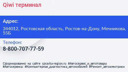 Qiwi, терминал по адресу 344012, Ростовская область, Ростов-на-Дону, Мечникова, 55Б в дальнейшем Организация, размещена в следующих категориях: