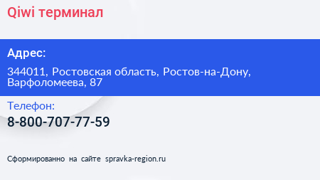 Qiwi, терминал по адресу 344011, Ростовская область, Ростов-на-Дону, Варфоломеева, 87 в дальнейшем Организация, размещена в следующих категориях: