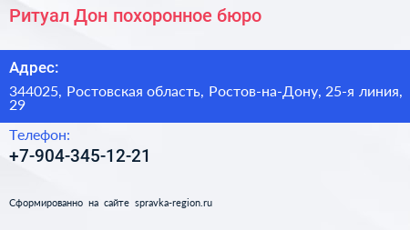 Ритуал-Дон, похоронное бюро по адресу 344025, Ростовская область, Ростов-на-Дону, 25-я линия, 29 в дальнейшем Организация, размещена в следующих категориях: