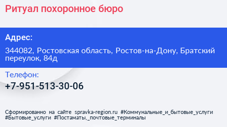 Ритуал, похоронное бюро по адресу 344082, Ростовская область, Ростов-на-Дону, Братский переулок, 84д в дальнейшем Организация, размещена в следующих категориях: