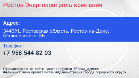 Ростов Энергоконтроль, компания по адресу 344091, Ростовская область, Ростов-на-Дону, Малиновского, 3Б в дальнейшем Организация, размещена в следующих категориях: