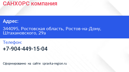 САНХОРС, компания по адресу 344095, Ростовская область, Ростов-на-Дону, Штахановского, 29а в дальнейшем Организация, размещена в следующих категориях: