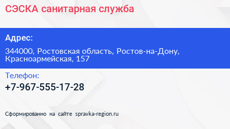 СЭСКА, санитарная служба по адресу 344000, Ростовская область, Ростов-на-Дону, Красноармейская, 157 в дальнейшем Организация, размещена в следующих категориях: