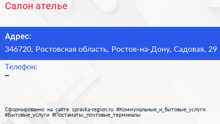 Салон-ателье по адресу 346720, Ростовская область, Ростов-на-Дону, Садовая, 29 в дальнейшем Организация, размещена в следующих категориях:
