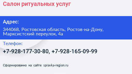 Салон ритуальных услуг по адресу 344068, Ростовская область, Ростов-на-Дону, Марксистский переулок, 4а в дальнейшем Организация, размещена в следующих категориях: