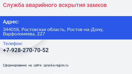 Служба аварийного вскрытия замков по адресу 344018, Ростовская область, Ростов-на-Дону, Варфоломеева, 227 в дальнейшем Организация, размещена в следующих категориях: