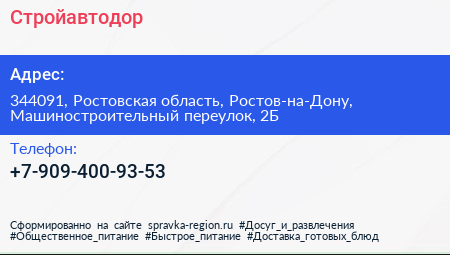 Стройавтодор по адресу 344091, Ростовская область, Ростов-на-Дону, Машиностроительный переулок, 2Б в дальнейшем Организация, размещена в следующих категориях: