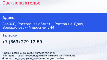 Светлана, ателье по адресу 344000, Ростовская область, Ростов-на-Дону, Ворошиловский проспект, 44 в дальнейшем Организация, размещена в следующих категориях: