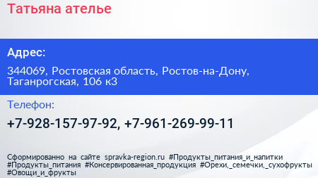 Татьяна, ателье по адресу 344069, Ростовская область, Ростов-на-Дону, Таганрогская, 106 к3 в дальнейшем Организация, размещена в следующих категориях: