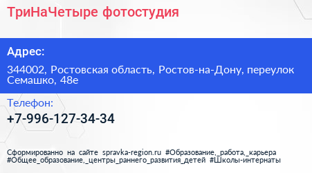 ТриНаЧетыре, фотостудия по адресу 344002, Ростовская область, Ростов-на-Дону, переулок Семашко, 48е в дальнейшем Организация, размещена в следующих категориях: