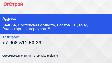 ЮгСтрой по адресу 344064, Ростовская область, Ростов-на-Дону, Радиаторный переулок, 9 в дальнейшем Организация, размещена в следующих категориях: