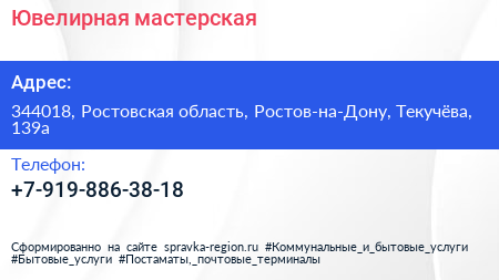 Ювелирная мастерская по адресу 344018, Ростовская область, Ростов-на-Дону, Текучёва, 139а в дальнейшем Организация, размещена в следующих категориях: