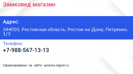 Замковед, магазин по адресу 344010, Ростовская область, Ростов-на-Дону, Петренко, 1/3 в дальнейшем Организация, размещена в следующих категориях: