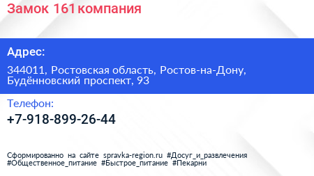 Замок 161, компания по адресу 344011, Ростовская область, Ростов-на-Дону, Будённовский проспект, 93 в дальнейшем Организация, размещена в следующих категориях: