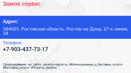 Замок-сервис по адресу 344025, Ростовская область, Ростов-на-Дону, 27-я линия, 18 в дальнейшем Организация, размещена в следующих категориях: