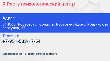 Я Расту, психологический центр по адресу 344065, Ростовская область, Ростов-на-Дону, Рощинский переулок, 17 в дальнейшем Организация, размещена в следующих категориях: