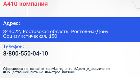 А410, компания по адресу 344022, Ростовская область, Ростов-на-Дону, Социалистическая, 150 в дальнейшем Организация, размещена в следующих категориях: