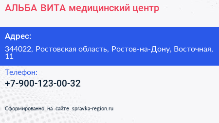 АЛЬБА ВИТА, медицинский центр по адресу 344022, Ростовская область, Ростов-на-Дону, Восточная, 11 в дальнейшем Организация, размещена в следующих категориях:
