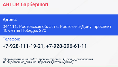 ARTUR, барбершоп по адресу 344111, Ростовская область, Ростов-на-Дону, проспект 40-летия Победы, 270 в дальнейшем Организация, размещена в следующих категориях: