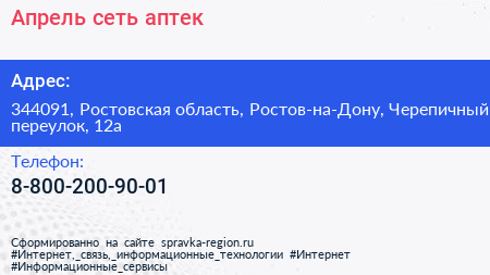 Апрель, сеть аптек по адресу 344091, Ростовская область, Ростов-на-Дону, Черепичный переулок, 12а в дальнейшем Организация, размещена в следующих категориях: