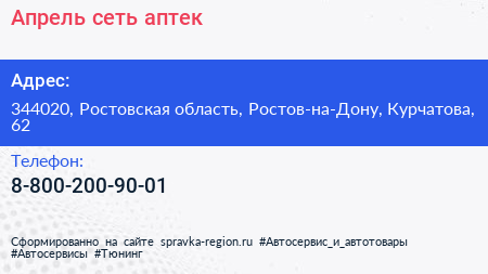 Апрель, сеть аптек по адресу 344020, Ростовская область, Ростов-на-Дону, Курчатова, 62 в дальнейшем Организация, размещена в следующих категориях: