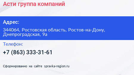Асти, группа компаний по адресу 344064, Ростовская область, Ростов-на-Дону, Днепроградская, 9а в дальнейшем Организация, размещена в следующих категориях: