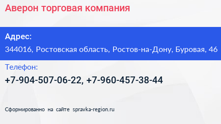 Аверон, торговая компания по адресу 344016, Ростовская область, Ростов-на-Дону, Буровая, 46 в дальнейшем Организация, размещена в следующих категориях: