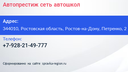 Автопрестиж, сеть автошкол по адресу 344010, Ростовская область, Ростов-на-Дону, Петренко, 2 в дальнейшем Организация, размещена в следующих категориях: