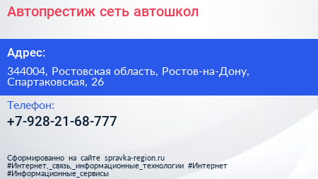 Автопрестиж, сеть автошкол по адресу 344004, Ростовская область, Ростов-на-Дону, Спартаковская, 26 в дальнейшем Организация, размещена в следующих категориях: