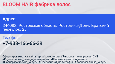 BLOOM HAIR, фабрика волос по адресу 344082, Ростовская область, Ростов-на-Дону, Братский переулок, 25 в дальнейшем Организация, размещена в следующих категориях:
