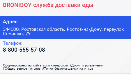 BRONIBOY, служба доставки еды по адресу 344000, Ростовская область, Ростов-на-Дону, переулок Семашко, 79 в дальнейшем Организация, размещена в следующих категориях: