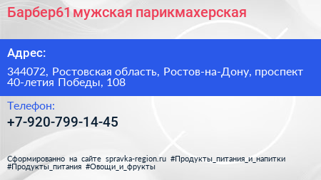 Барбер61, мужская парикмахерская по адресу 344072, Ростовская область, Ростов-на-Дону, проспект 40-летия Победы, 108 в дальнейшем Организация, размещена в следующих категориях: