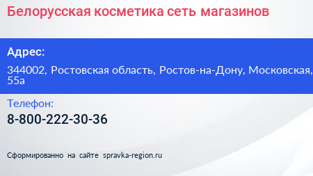 Белорусская косметика, сеть магазинов по адресу 344002, Ростовская область, Ростов-на-Дону, Московская, 55а в дальнейшем Организация, размещена в следующих категориях: