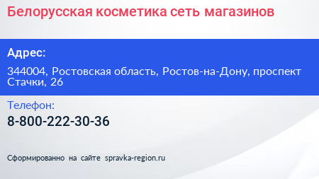 Белорусская косметика, сеть магазинов по адресу 344004, Ростовская область, Ростов-на-Дону, проспект Стачки, 26 в дальнейшем Организация, размещена в следующих категориях: