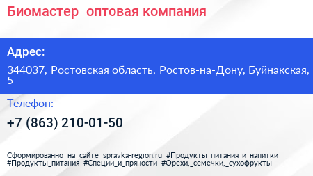 Биомастер+, оптовая компания по адресу 344037, Ростовская область, Ростов-на-Дону, Буйнакская, 5 в дальнейшем Организация, размещена в следующих категориях: