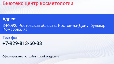 Бьютекс, центр косметологии по адресу 344092, Ростовская область, Ростов-на-Дону, бульвар Комарова, 7а в дальнейшем Организация, размещена в следующих категориях: