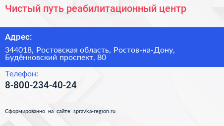 Чистый путь, реабилитационный центр по адресу 344018, Ростовская область, Ростов-на-Дону, Будённовский проспект, 80 в дальнейшем Организация, размещена в следующих категориях: