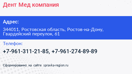 Дент-Мед, компания по адресу 344011, Ростовская область, Ростов-на-Дону, Гвардейский переулок, 61 в дальнейшем Организация, размещена в следующих категориях: