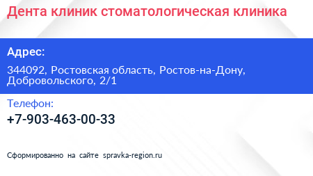 Дента клиник, стоматологическая клиника по адресу 344092, Ростовская область, Ростов-на-Дону, Добровольского, 2/1 в дальнейшем Организация, размещена в следующих категориях: