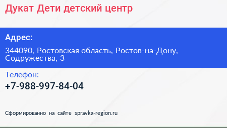 Дукат Дети, детский центр по адресу 344090, Ростовская область, Ростов-на-Дону, Содружества, 3 в дальнейшем Организация, размещена в следующих категориях: