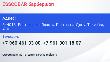 ESSCOBAR, барбершоп по адресу 344018, Ростовская область, Ростов-на-Дону, Текучёва, 246 в дальнейшем Организация, размещена в следующих категориях: