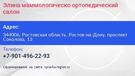 Элина, маммологическо-ортопедический салон по адресу 344006, Ростовская область, Ростов-на-Дону, проспект Соколова, 13 в дальнейшем Организация, размещена в следующих категориях: