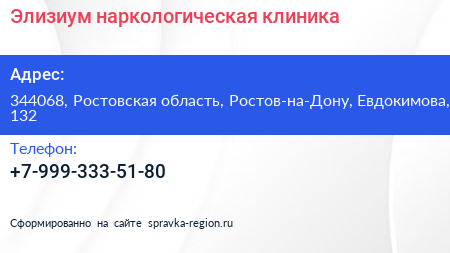 Элизиум, наркологическая клиника по адресу 344068, Ростовская область, Ростов-на-Дону, Евдокимова, 132 в дальнейшем Организация, размещена в следующих категориях: