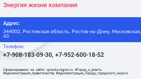 Энергия жизни, компания по адресу 344002, Ростовская область, Ростов-на-Дону, Московская, 43 в дальнейшем Организация, размещена в следующих категориях: