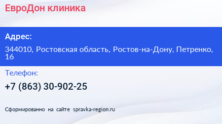 ЕвроДон, клиника по адресу 344010, Ростовская область, Ростов-на-Дону, Петренко, 16 в дальнейшем Организация, размещена в следующих категориях: