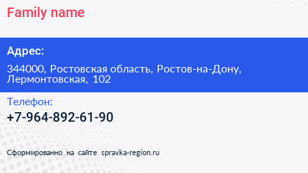 Family name по адресу 344000, Ростовская область, Ростов-на-Дону, Лермонтовская, 102 в дальнейшем Организация, размещена в следующих категориях:
