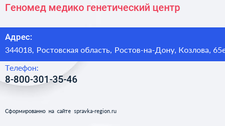 Геномед, медико-генетический центр по адресу 344018, Ростовская область, Ростов-на-Дону, Козлова, 65е в дальнейшем Организация, размещена в следующих категориях: