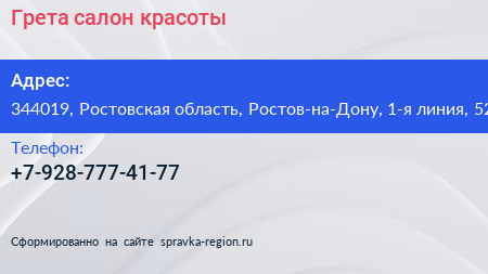 Грета, салон красоты по адресу 344019, Ростовская область, Ростов-на-Дону, 1-я линия, 52 в дальнейшем Организация, размещена в следующих категориях:
