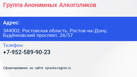 Группа Анонимных Алкоголиков по адресу 344002, Ростовская область, Ростов-на-Дону, Будённовский проспект, 26/57 в дальнейшем Организация, размещена в следующих категориях: