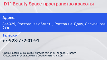 ID11 Beauty Space, пространство красоты по адресу 344029, Ростовская область, Ростов-на-Дону, Селиванова, 68д в дальнейшем Организация, размещена в следующих категориях: